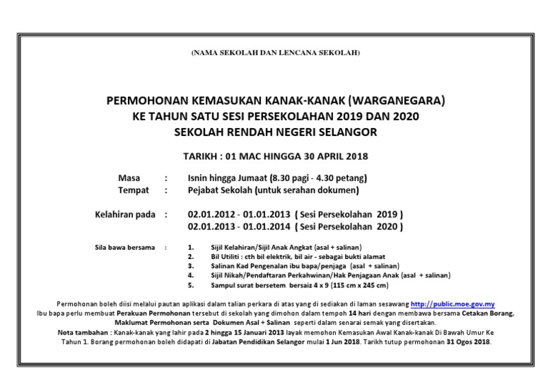 Semakan Pendaftaran Murid Tahun 1 2019 2020 Online Pendidikan Malaysia from 3.bp.blogspot.com Permohonan kemasukan murid ke tahun satu bagi ambilan 2019 dan 2020 akan dibuka seperti berikut untuk makluman, keputusan permohonan murid tahun 1 atau status pendaftaran akan diumumkan sekitar bulan julai/ ogos 2018 (tarikh akan dikemaskini). Surat permohonan adalah salah satu surat resmi yang berisi permintaan tentang suatu hal kepada pihak lain. Semakan keputusan permohonan murid tahun 1 2018 online. Penggunaan surat permohonan rekomendasi mayoritas dibutuhkan oleh kelompok, misalnya 1. Permohonan atas talian ini terbuka kepada seluruh negeri semenanjung malaysia (negeri sabah, sarawak dan w.p labuan adalah melalui sekolah secara manual.) Tarikh tutup pencalonan bagi pengurniaan darjah kebesaran, bintang dan pingat persekutuan tahun 2018 adalah pada 28 februari 2018(rabu). S) 1 (satu) set daftar riwayat hidup yang ditandatangani oleh peserta seleksi dan bermeterai, yang formulir. Permohonan pendaftaran murid tahun satu bagi ambilan 2019 / 2020 boleh dibuat menerusi sistem aplikasi pendaftaran atas talian (spat) kementerian pendidikan malaysia (kpm).